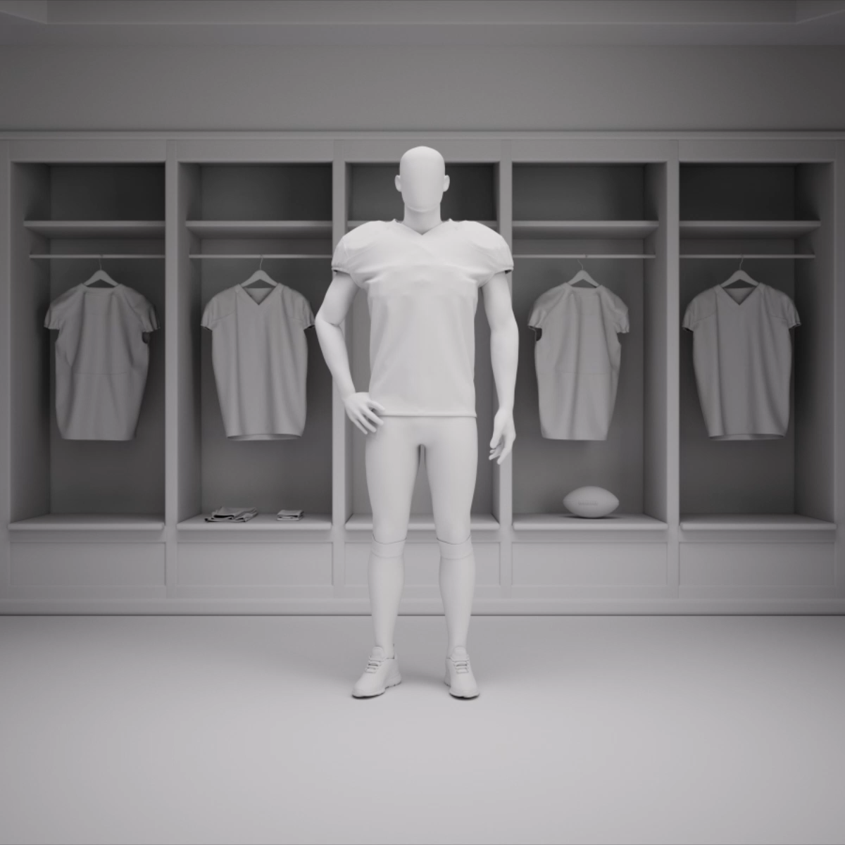 Aperçus des maillots, des hauts d'entraînement, des couches de bord de terrain et des articles de soutien avec des rendus 3D précis en éclairage qui facilitent l'approbation des couleurs, des finitions, des numéros et des placements de sponsors.